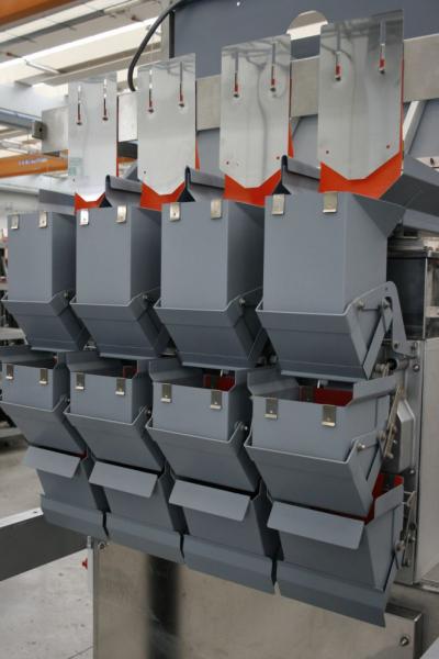 4-head weigher powered by stepping motors, straight disposition, with product flow from a distribution system.