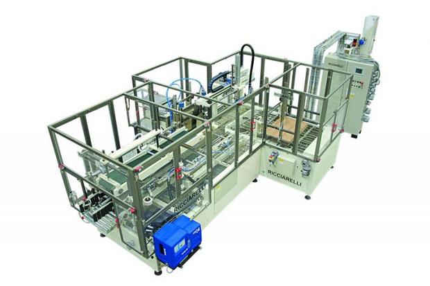 Encaisseuse automatique pour étuis à placer en cartons pré-encollés de type américain (RSC). Les étuis sont poussés dans les cartons par des pousseurs. L’encaisseuse est fournie avec un encolleur et/ou une enrubanneuse à la sortie. Vitesse max. en entrée: jusqu’à 120 sachets à la minute.