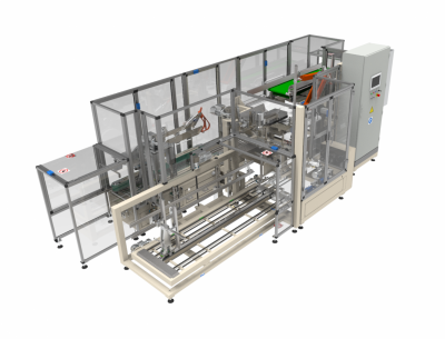 Encaisseuse automatique pour sachets avec introduction des sachets couchés dans les cartons préencollés de type américain (RSC), avec manipulateur robotisé, encolleur et/ou enrubanneuse à la sortie.