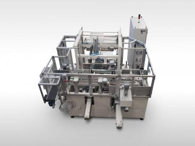 Fardeleuse automatique à double enveloppement, pour le regroupement, le comptage et ensuite la stratification des sachets provenant de la conditionneuse en amont pour la formation d’un fardeau enveloppé dans un premier temps transversalement avec une bande de polyéthylène puis emballé avec du polyéthylène thermorétractable. Vitesse max. en entrée: jusqu’à 120 sachets à la minute selon la composition du fardeau.