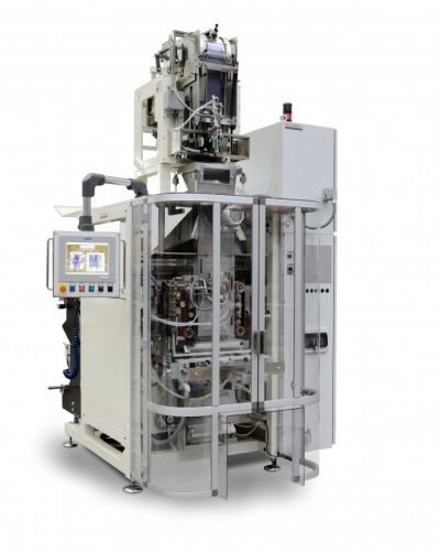 Conditionneuse verticale form - fill - seal mod. VSCL en sachets formés à partir de bobines de film accouplé et à filet polyéthylène, disponible dans sa version standard et version acier inoxydable. Vitesse mécanique max: 70 sachets à la minute.