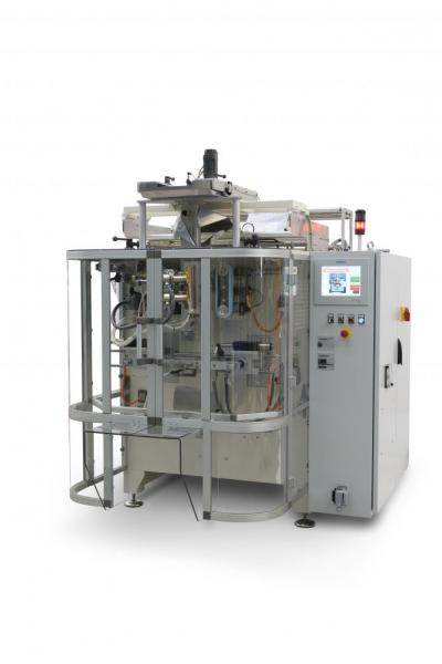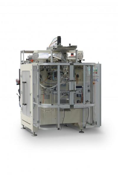 Conditionneuse verticale continue form-fill-seal mod. VS150 à grande vitesse en sachets formés par une bobine de film accouplé et polyéthylène, disponible en version standard, inclinée et en acier inoxydable.