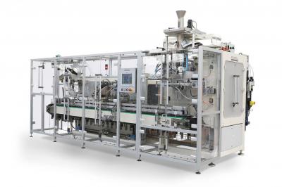 Confezionatrice verticale continua ad alta velocità per la formazione di sacchetti a cuscino, fondo quadro e doppio fondo quadro utilizzando film flessibile avvolto in bobina (sistema di saldatura a barra calda, azionamento del sistema saldante a inseguimento e del trascinamento film con servomotori brushless) abbinata al gruppo automatico per chiudere sacchetti a doppio fondo quadro per prodotti alla rinfusa in posizione verticale, attrezzata per un formato.